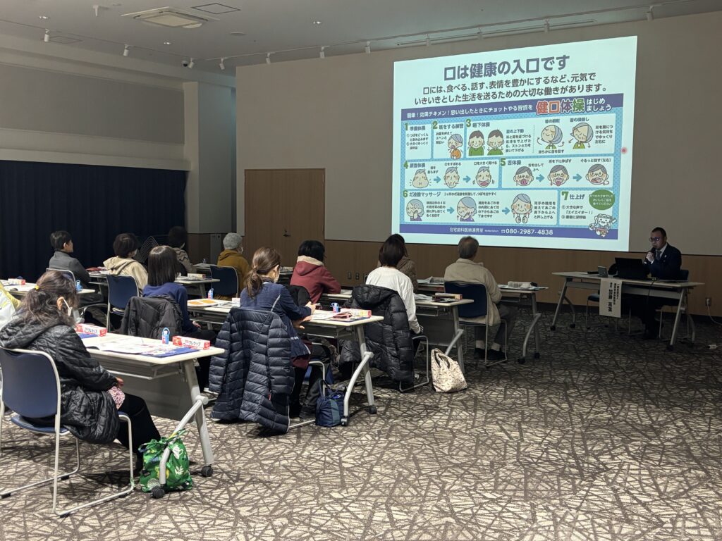 前半は健康講座として「オーラルフレイルと口腔体操」をテーマに、歯の健康について学びました。毎日の生活に取り入れやすい内容も多く、参加者の皆さんも熱心に耳を傾けられていました。後半は「介護助手交流会」と題し、現役介護助手さんと介護助手受入れ施設の介護職員さんへのインタビューを行いました。実際の仕事内容ややりがい、現場のリアルな声を聞くことができ、参加者の皆さんにとって介護助手という働き方をより身近に感じていただける時間となりました。