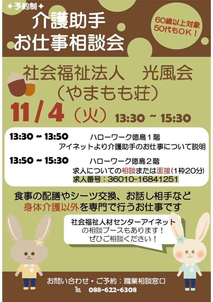 トップページ > セミナー > 介護助手お仕事相談会inハローワーク徳島 2025年10月27日 11/4(火)13:30~15:30より、ハローワーク徳島にて介護助手お仕事相談会を開催いたします。 福祉人材センターアイネットより介護助手のお仕事について説明、社会福祉法人光風会やまもも荘の求人についての相談または面接を予定しております。 是非、御参加ください。 Twitter Share LINE コピーする